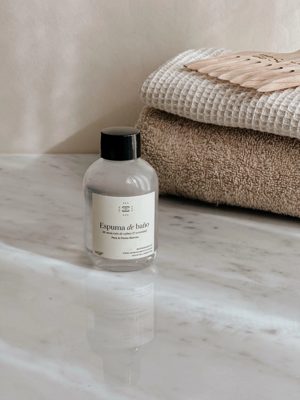 Llená la bañadera y poné un poco de espuma justo en el chorro de agua para que se genere la espuma con la presión del chorro de agua. Vas a ver como a los pocos segundos se empieza a generar mucha espuma. Ideal para combinar con nuestras sales o bomba efervescente y tomarse un baño relajante.